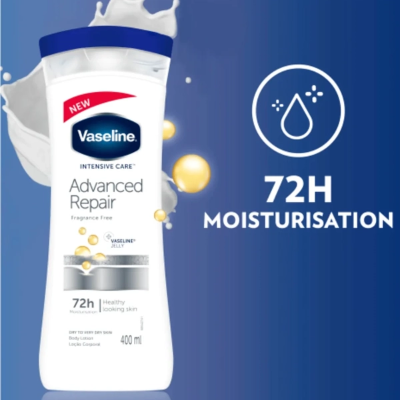 لوسیون بدن وازلین سفید اصل مناسب پوست خیلی خشک بی بو آبرسان 72 ساعته 400 میل | Vaseline Advanced Repair fragrance free for very dry skin Body Lotion moisturisation 72h 400ml