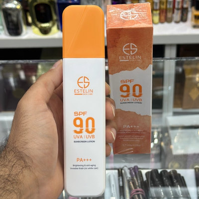 ضد آفتاب فلویید بی رنگ استلین اصل روشن کننده و ضد چروک با spf90 نارنجی رنگ مناسب انواع پوست 120 گرم | ESTELIN Sunscreen Lotion Brightening & anti-aging Spf90 Invisible finish 120gr